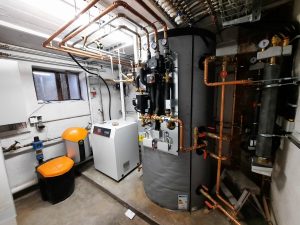 Nachdem 2021 die Option auf Anschluss des Gebäudes an ein Geothermie-Fernwärmenetz entfiel, wurde die Ölheizung durch eine Wärmepumpe ersetzt. An die Wärmepumpe ist ein Pufferspeicher mit intelligenter Steuerung angeschlossen, der den Betrieb der Wärmepumpe optimiert und Solarenergie in Form von heißem Wasser speichert.