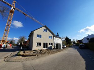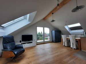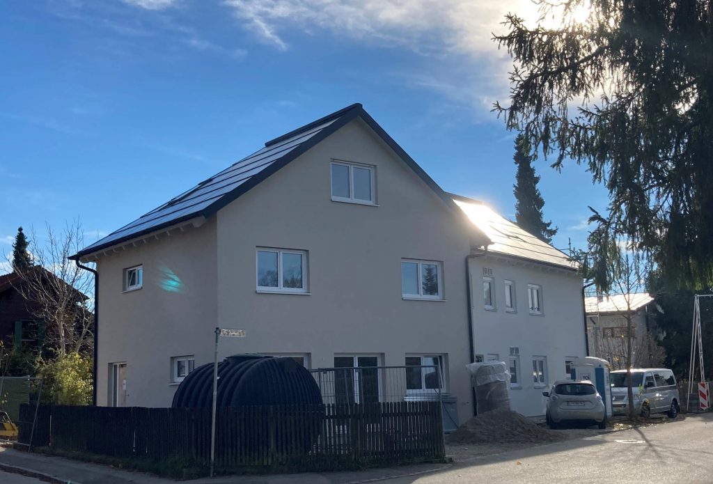Die beiden 80 m² Wohnungen des Altbaus von 1964 wurden seit 2014 sukzessive saniert und energetisch aufgewertet. Es war ein essentielles Ziel die alte Ölheizung durch eine Wärmepumpe austauschen zu können. Das Dach des Altbaus wurde 2021 im Zuge des Anbaus der Doppelhaushälfte erneuert. Durch die Erhöhung der Dachneigung von 25° auf 35° entstand eine attraktive 49 m² Dachgeschosswohnung. Zudem entspricht die Dachdämmung dem aktuellen Standard. Die Dacheindeckung des Alt- und Neubaus erfolgte aus ästhetischen und wirtschaftlichen Gründen ausschließlich mit einem Indach-PV-System.